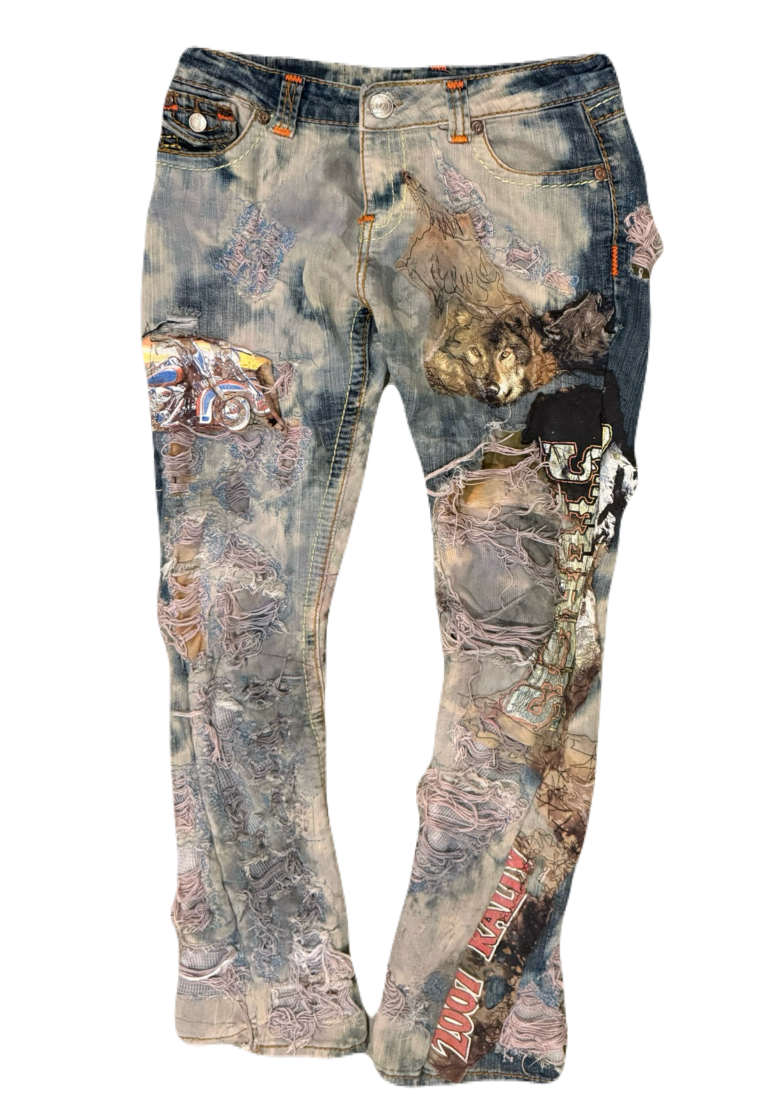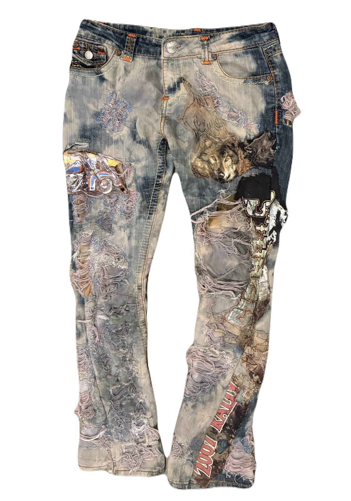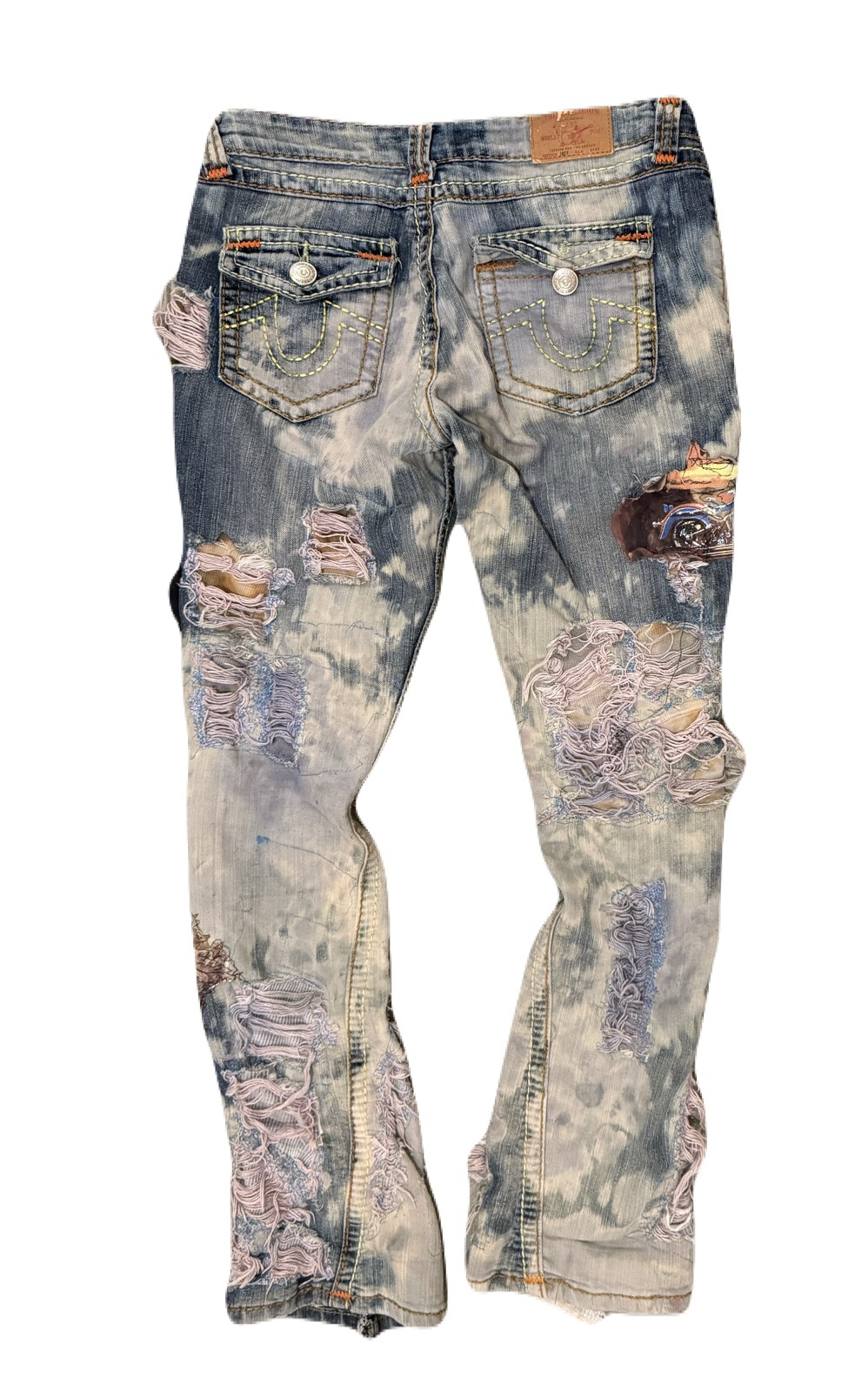 Heavily distressed and repaired true religion denim